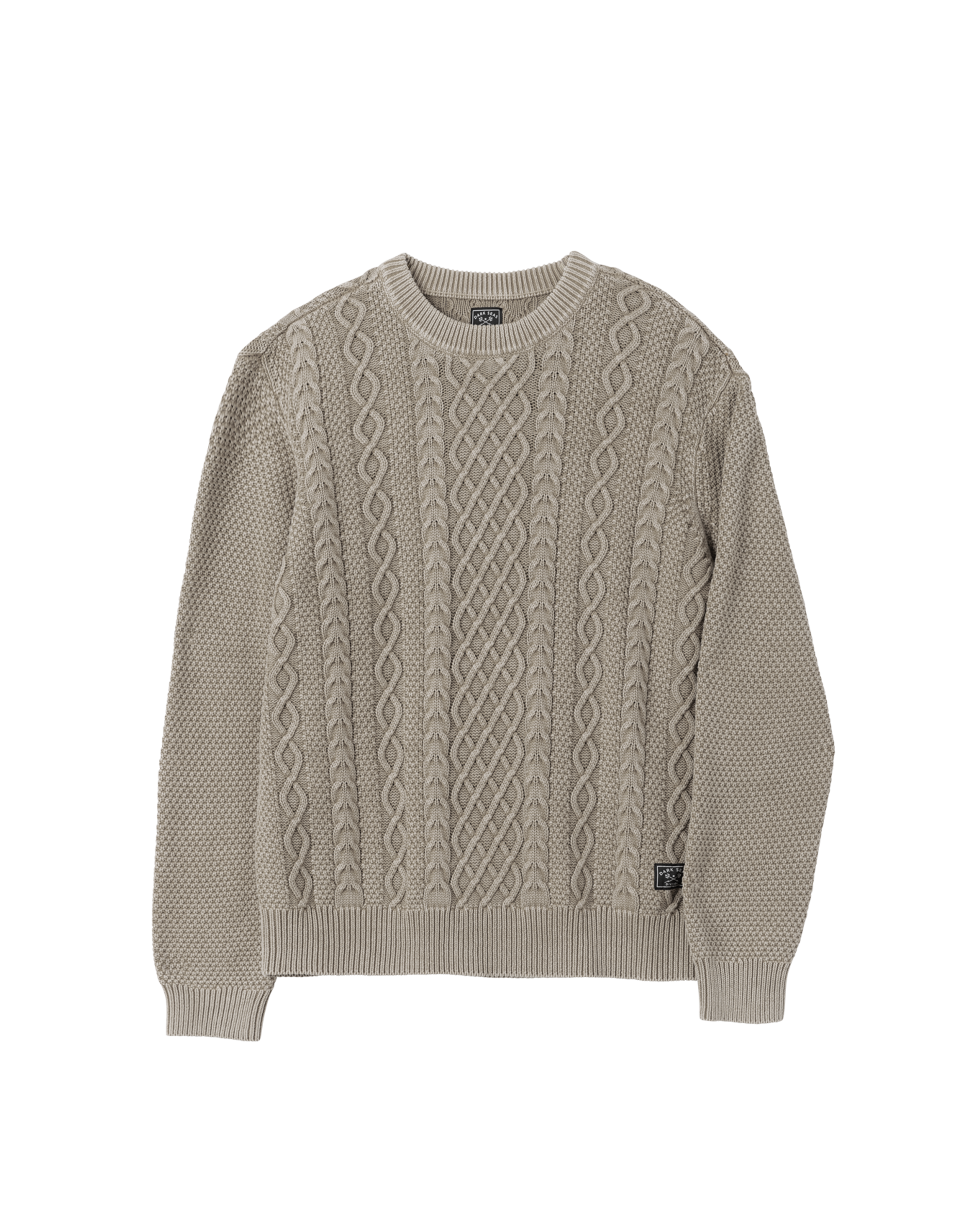 Cable knit crew with a waffle-textured sleeve and enzyme-washed finish. Your elevated everyday sweater.
