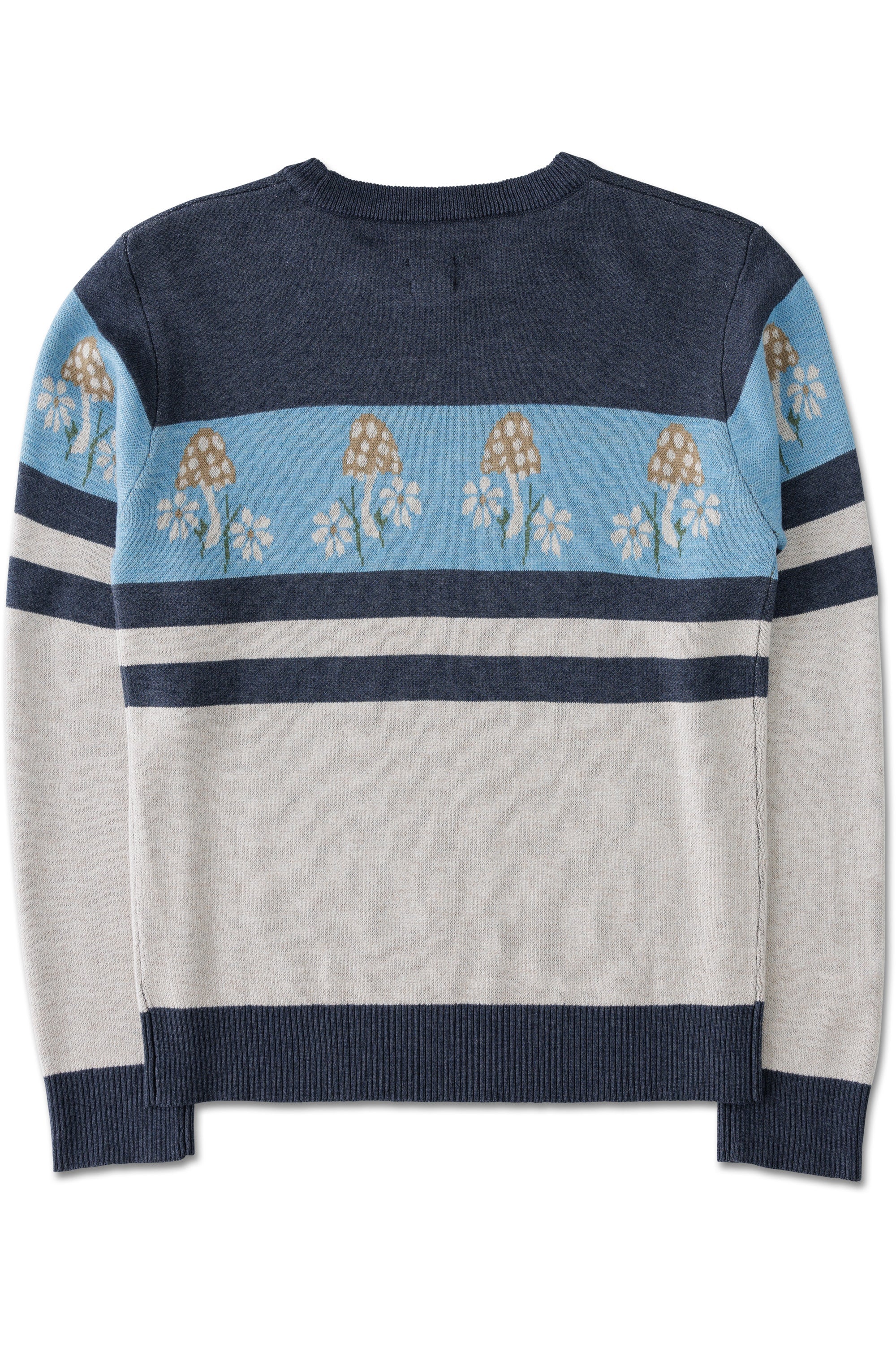 Semi-fitted, birdseye jacquard fully fashioned crew neck sweater, ribbed collar, cuffs, and hem, hip length.