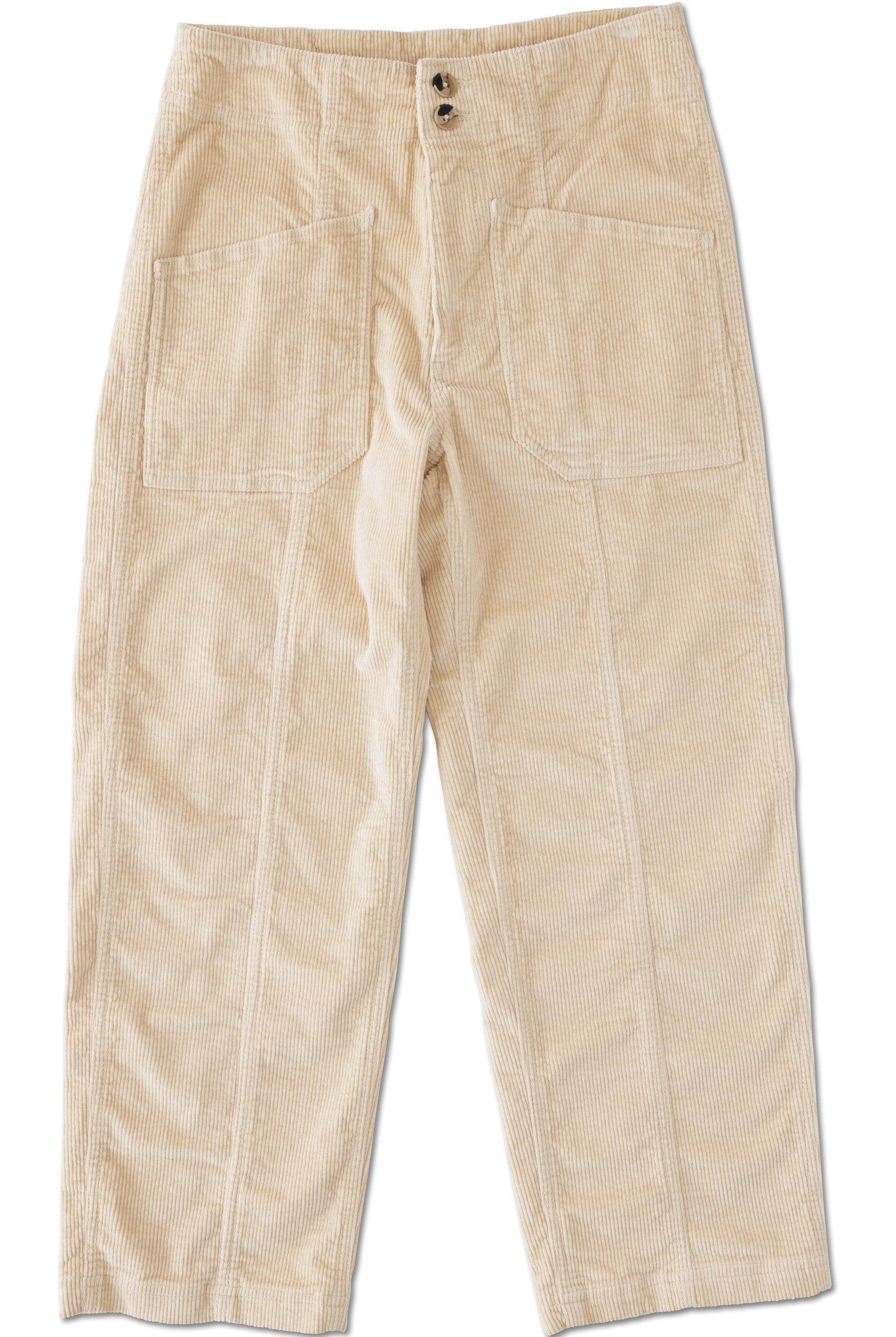 Fixed waist high-rise wide leg crop pant, two button and zip fly, utility patch pockets on front and back, vertical seam styling, thick thread and double needle reinforced seams.