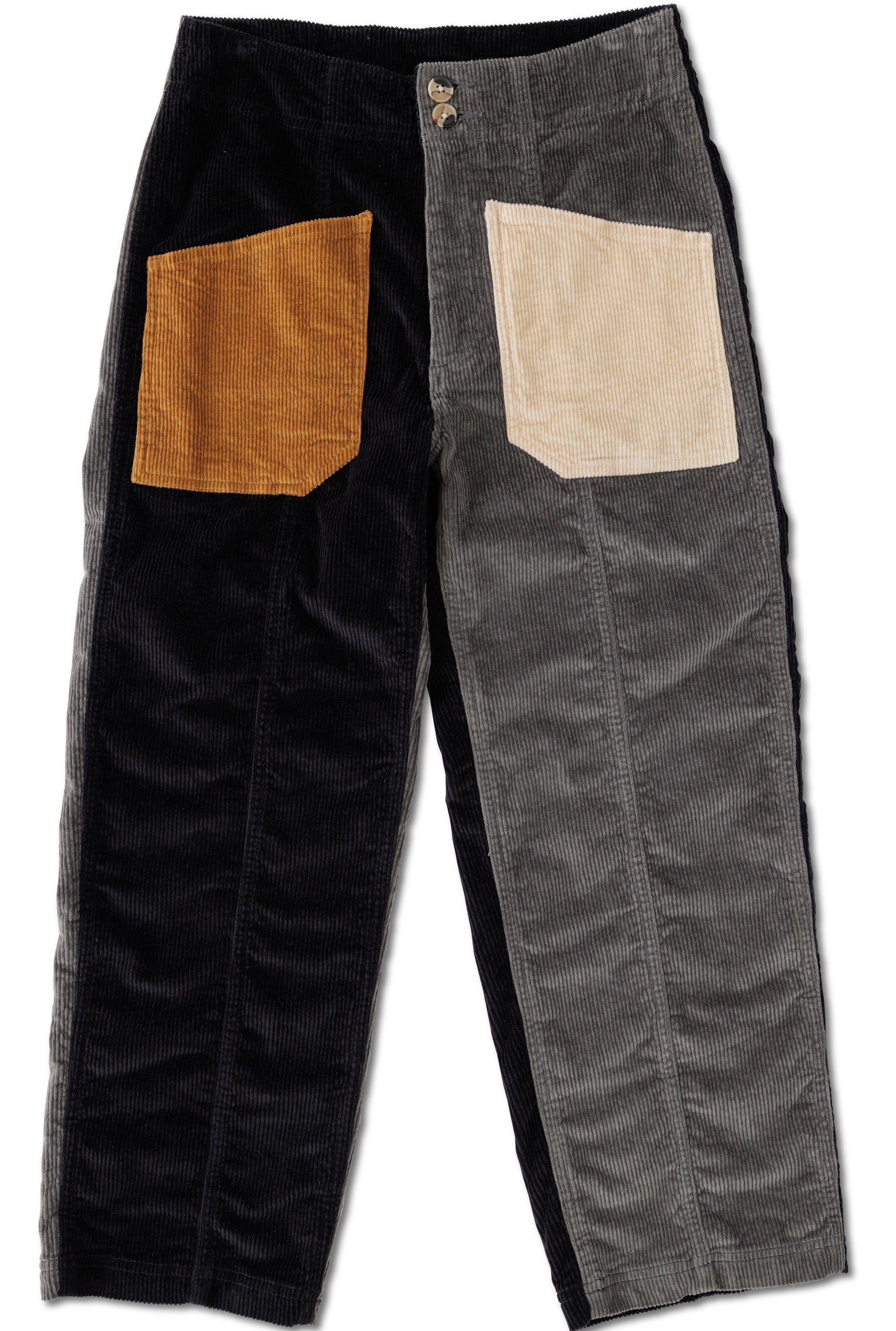 Fixed waist high-rise wide leg crop pant, two button and zip fly, utility patch pockets on front and back, vertical seam styling, thick thread and double needle reinforced seams.