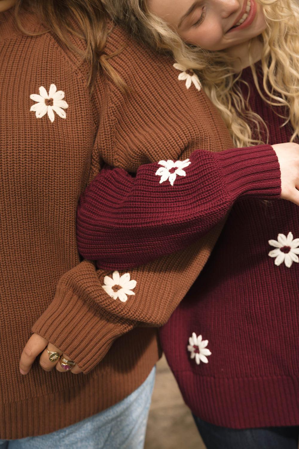 - Chunky knit with embroidered flowers
