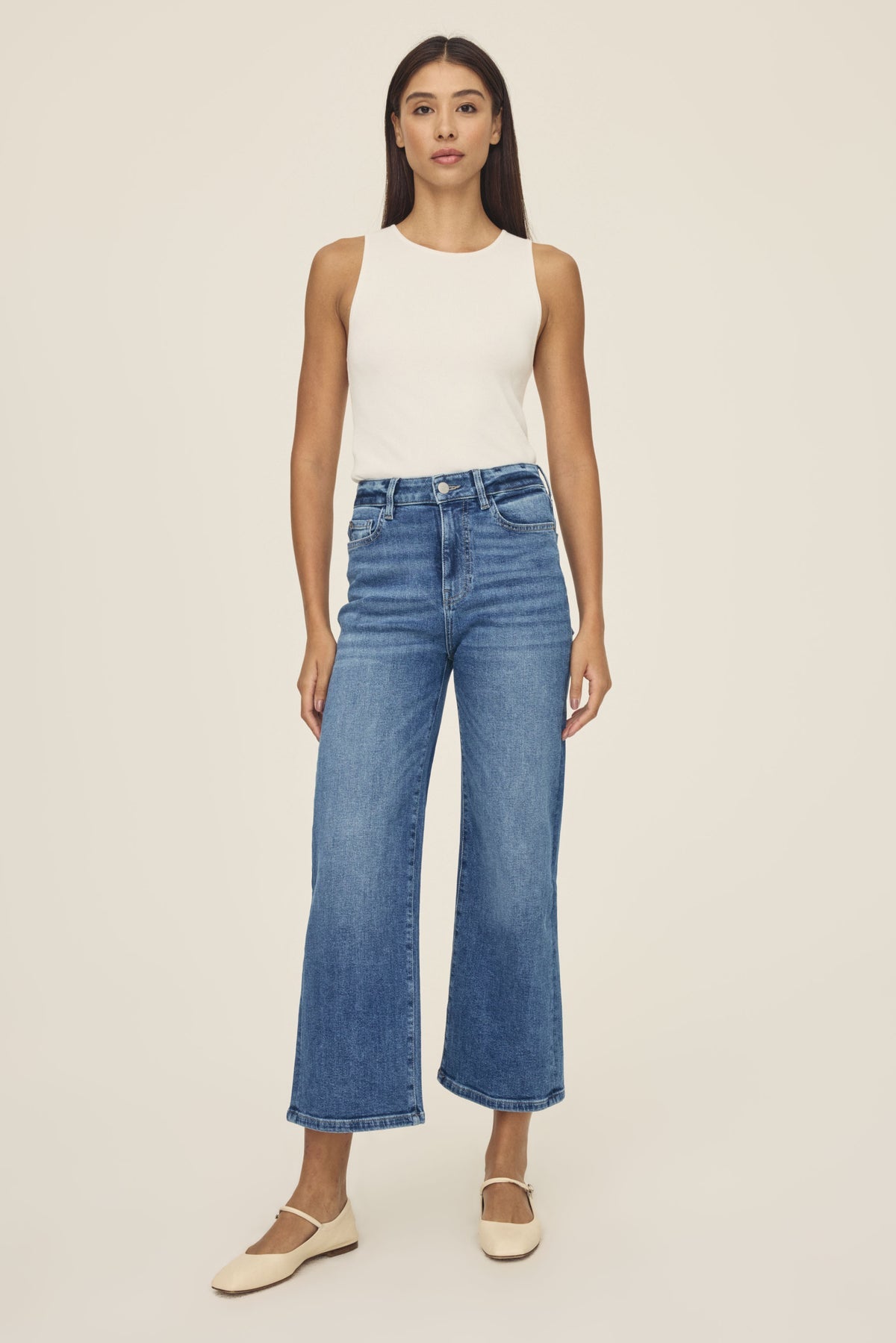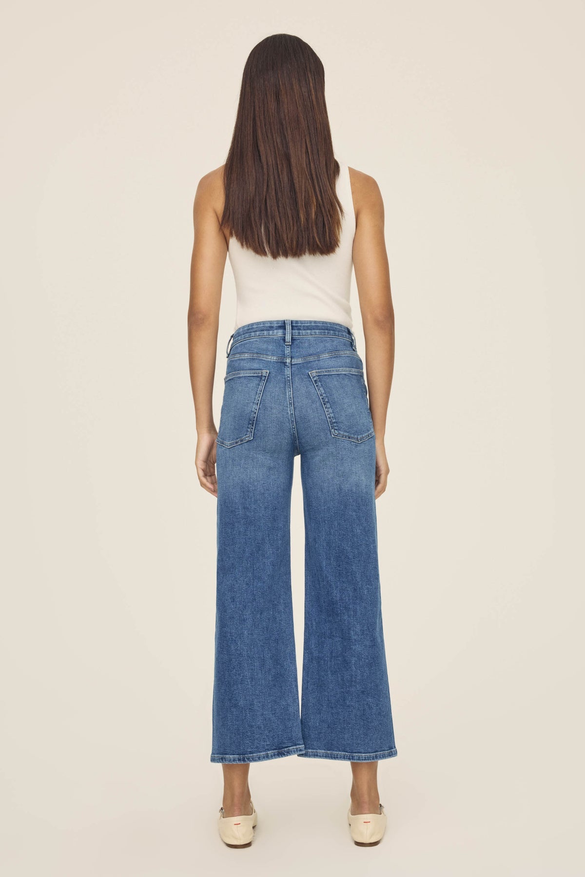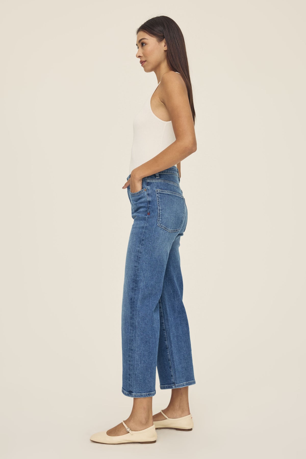 A nod to trendsetting style in Seoul, this high rise style is a fresh alternative to your skinnies. Sculpts through the midsection and widens out through the leg to a flattering A-line shape. Modern, timeless and versatile.Crossroads is a mid-to-dark indigo hue with subtle fading throughout and clipping detail at the waist. It features a silver shank and copper rivets, khaki stitching and a clean hem.